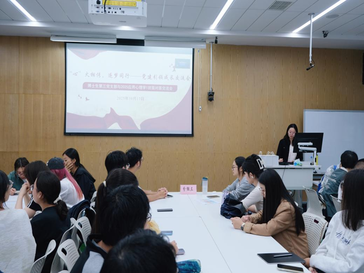 发布时间: 2025-10-20 来源: 作者: 浏览次数:为落实立德树人根本任务,充分发挥党建在学生思想引领与成长成才中的核心作用,10月17日下午,西南大学心理学部博士生第三党支部在第二教学楼2218室举办“心火相传・逐梦同行”党建引领成长交流会暨主题党日活动。活动聚焦“党建引领+学业成长”新模式,搭建起博士生、硕士生与本科生共话成长、携手奋进的交流平台。支部全体党员与2025级应心心理学1班本科生参加此次活动。活动由党支部书记史攀主持。