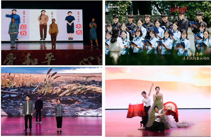 历史文化学院 民族学院的视频节目《烽火白沙》、新闻传媒学院的朗诵《麦田里的呼喊》、音乐学院的歌舞表演《我爱你,中国》,分别回溯抗战时期教育救国历程、传递战火中民众力量与抒发爱国深情,为这场展演增添了鲜活多元的色彩。