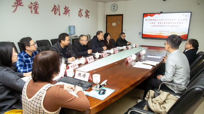 发布时间: 2025-12-24 来源: 作者: 浏览次数:12月22日下午,西南大学心理学部党委理论学习中心组以“学习贯彻党的二十届四中全会精神,奋力谱写‘十五五’党建与事业高质量发展新篇”为主题,于202会议室召开2025年第七次集中学习研讨会。学校党委委员、蚕桑纺织与生物质科学学院院长代方银列席并督导此次会议。心理学部全体党委委员、非党员处级领导干部参加。党委书记黄泽文主持会议。