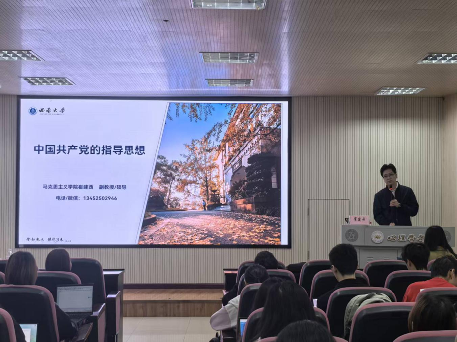 11月8日下午,马克思主义学院副教授崔建西主讲《中国共产党的指导思想》。他系统梳理了党的指导思想与时俱进的发展脉络,深刻阐述了马克思主义中国化时代化的理论成果及其实践伟力,引导学员们深刻理解了“中国共产党为什么能,中国特色社会主义为什么好,归根到底是马克思主义行,是中国化时代化的马克思主义行”的深层逻辑。课程强调要掌握“聚焦学、系统学、正确学、务实学”的方法论,真正用党的创新理论武装头脑、指导实践。