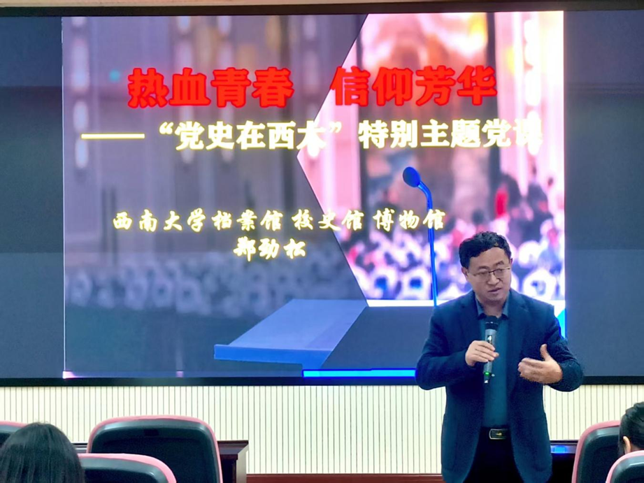 11月15日下午,学校档案馆、校史馆、博物馆副馆长郑劲松生动讲授《党史在西大》。他将百年校史融入党史长河,通过一个个感人至深的校友革命故事与奋斗事迹,使抽象的信仰变得具体可感。肖明华、万涛等烈士的忠诚,侯光炯、胡锦矗等前辈的奉献,生动诠释了信仰是融入血脉的精神力量。校史中的红色基因深刻启示学员:个人的成长只有与时代需要同频共振,青春的价值才能在服务大局中绽放光芒。